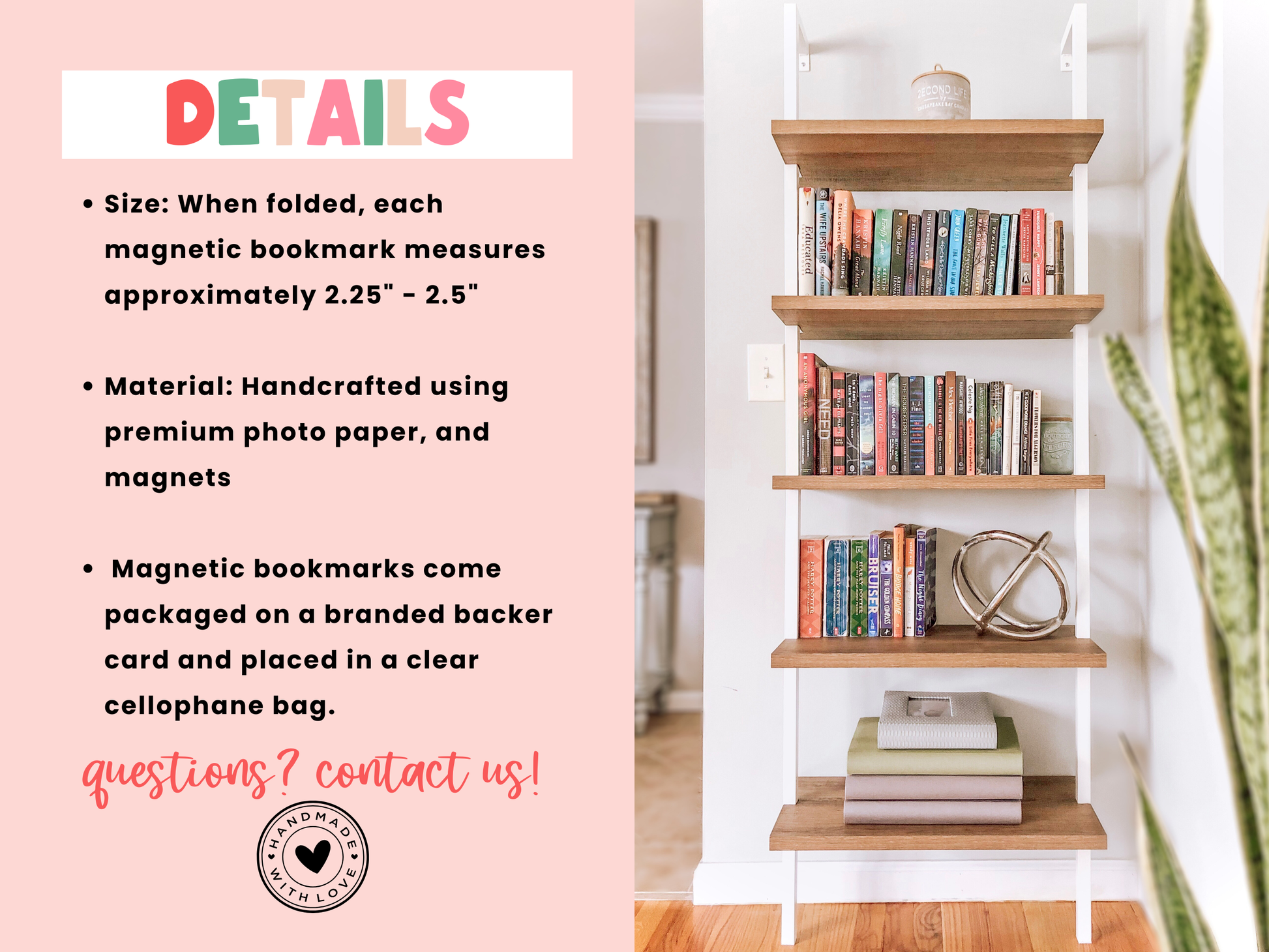 • Size: When folded, magnetic bookmarks measure approximately 2.25" - 2.5"