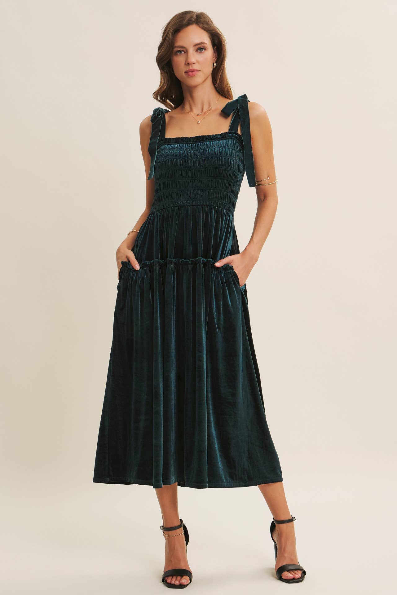 HOLIDAY CLASSIC VELVET SMOCKED MIDI DRESS WITH POCKETS