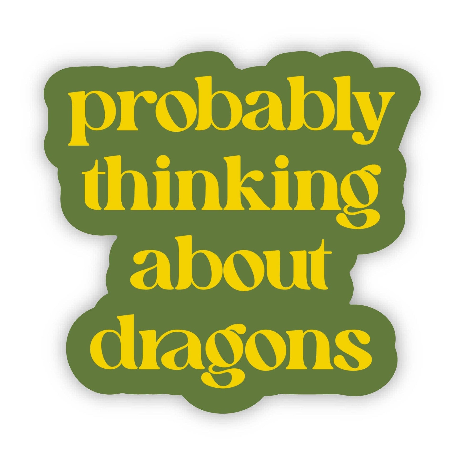 Calling all fantasy enthusiasts! Get this text sticker to let everyone know you're "probably thinking about dragons". High quality vinyl sticker. Great to decorate laptops, water bottles, car windows, coolers, suitcases, bikes, kayaks, phone cases, journals, and more.