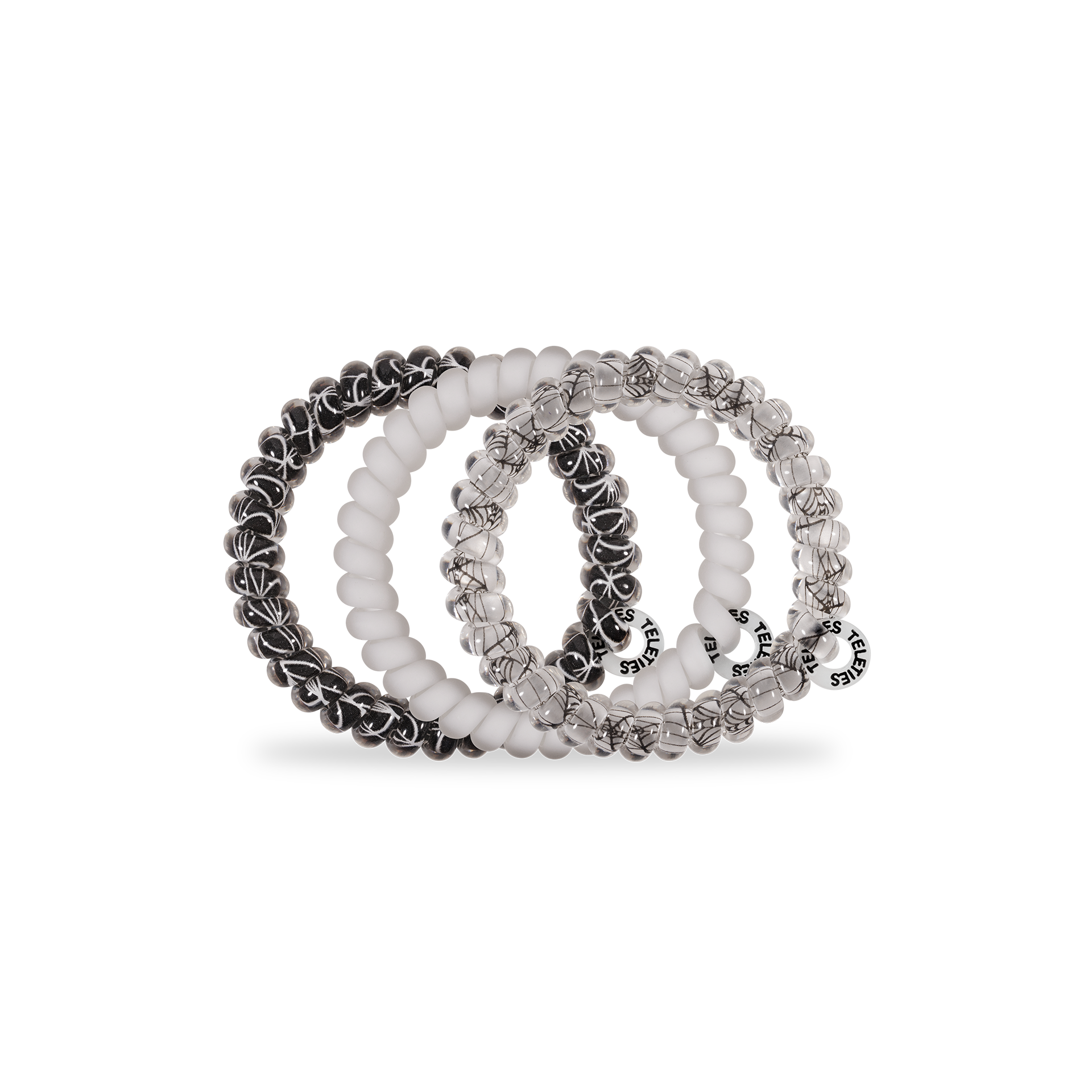Webbed Small Hair Ties in Black and White offer a strong grip without damage, doubling as a chic wrist accessory when not in use. Your new favorite hair essentials all year round.