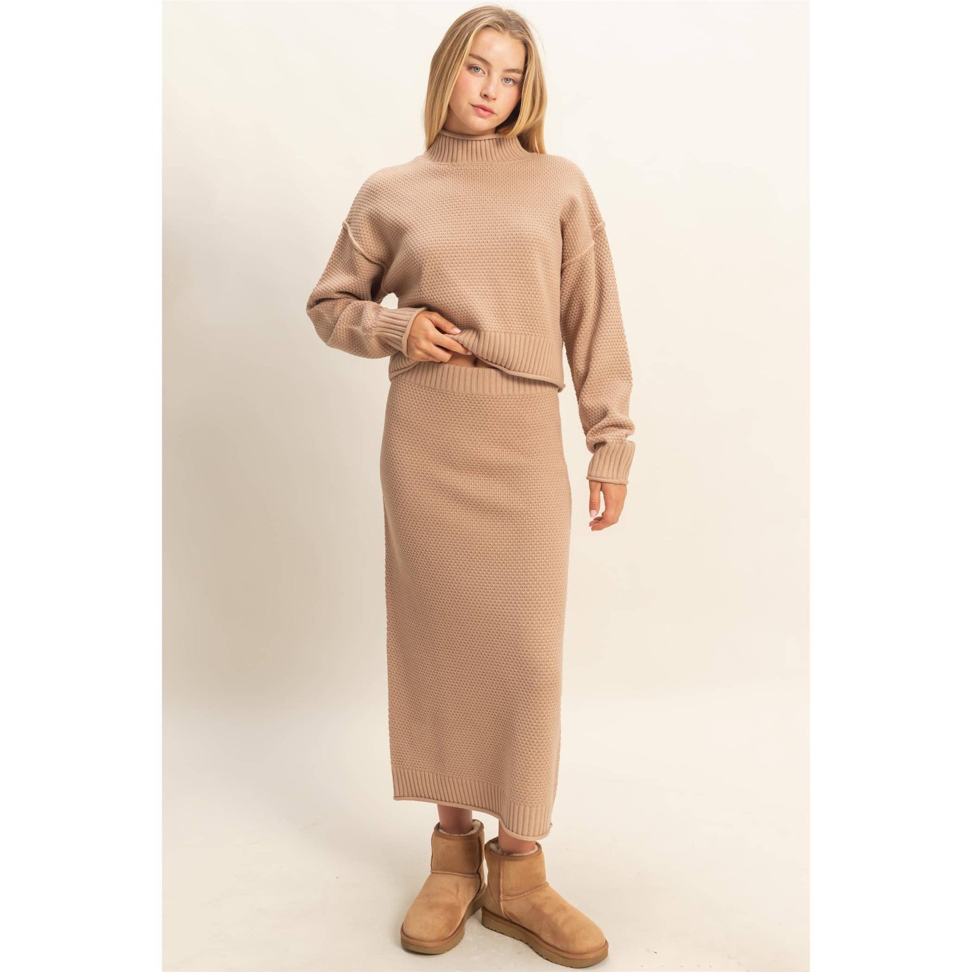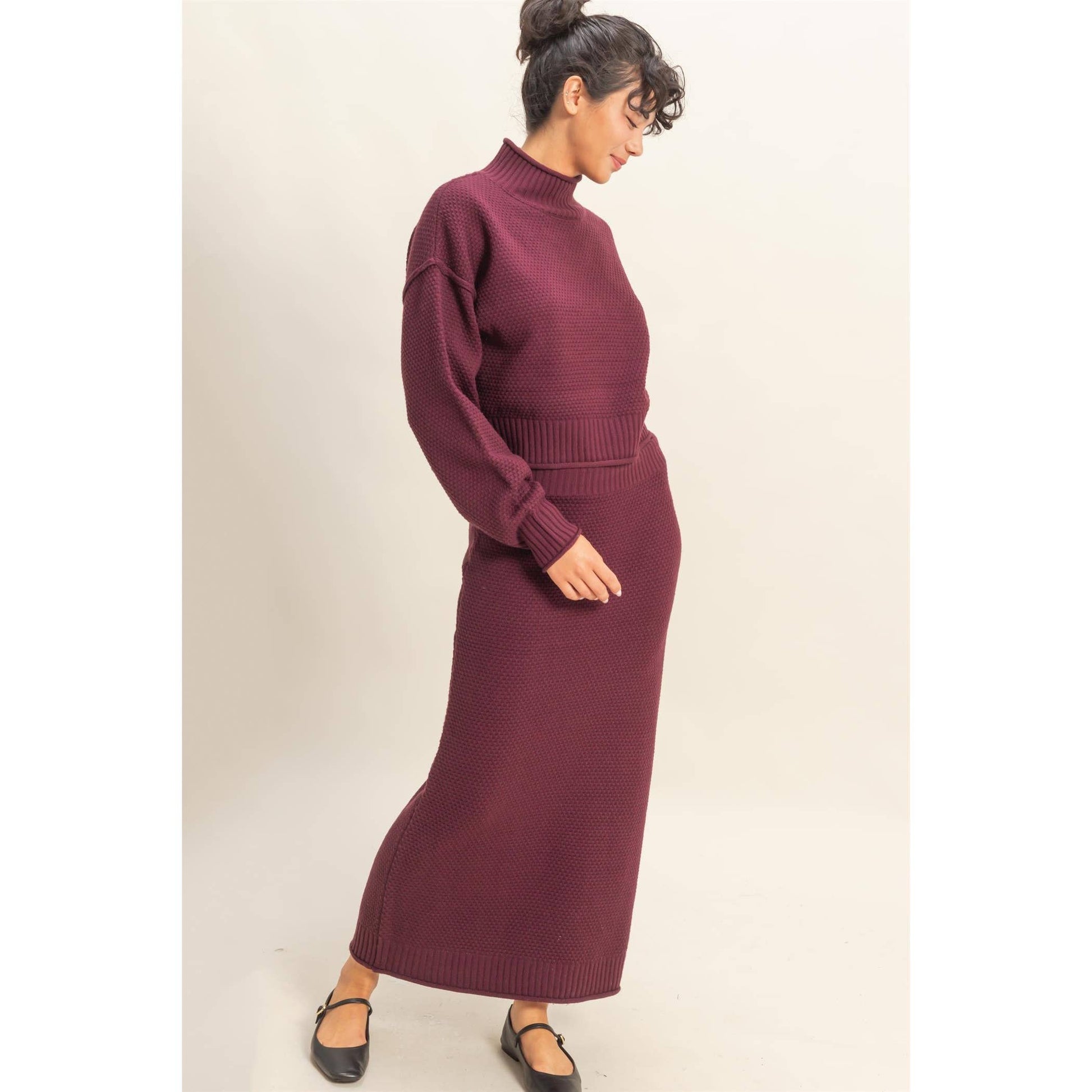 This coordinated set features a textured high neck sweater and a matching long skirt that offers both comfort and style. Its relaxed fit is ideal for layering, making it perfect for chilly days or casual evenings. Pair with minimal jewelry and loafers for a polished look. The versatility ensures it can transition from office to outings effortlessly.